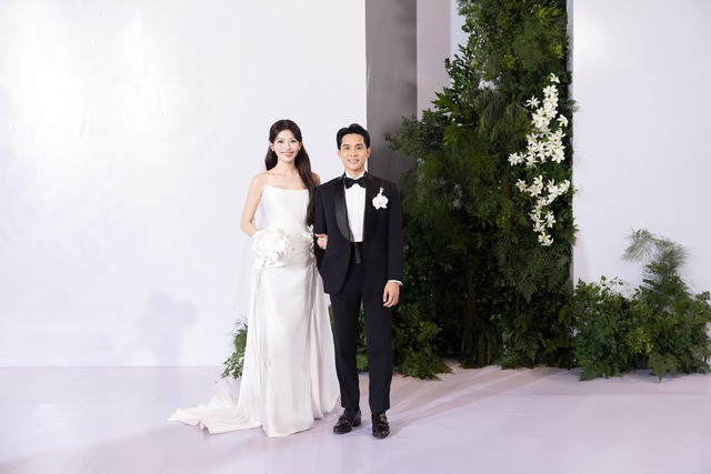 Thiết kế đầu tiên người đẹp diện có phom dáng cúp ngực cùng điểm nhấn là chi tiết khăn voan vắt qua cổ. Trong khi đó, chú rể diện vest trắng kết hợp quần âu đen, cổ đeo nơ vô cùng bảnh bao. Cả hai được khen vô cùng xứng đôi.