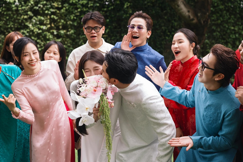Chú rể không ngại trao cho cô dâu nụ hôn ngọt ngào trên má. Cả hai được khen vô cùng đẹp đôi và có nét phu thê.