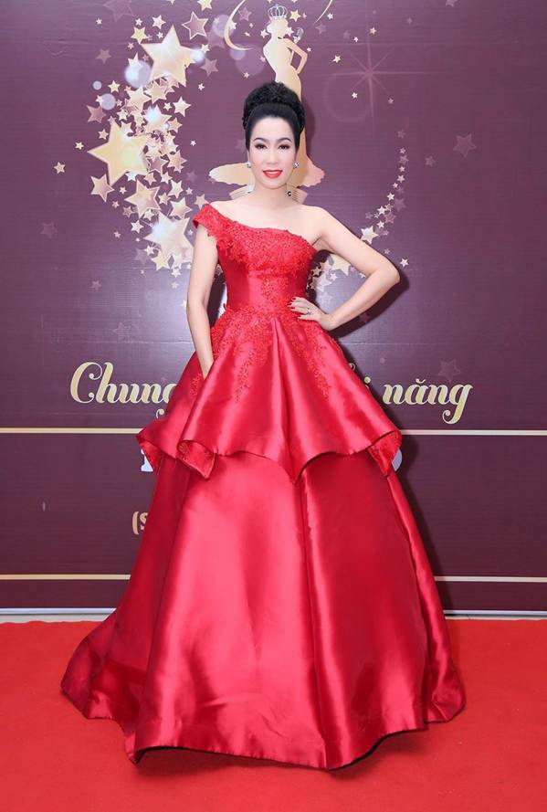 Diện bộ đầm dạ hội lệch vai màu đỏ rực rỡ, Trịnh Kim Chi khoe vai trần quyến rũ.