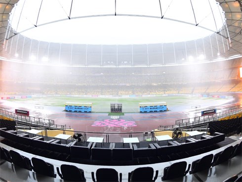 Mặt sân Bukit Jalil ướt sũng trong cơn mưa lớn
