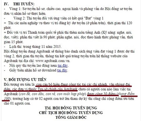 Đáng lưu ý, thông báo tuyển dụng của ngân hàng do chủ tịch Hội đồng tuyển dụng là ông Tổng giám đốc ký tên có phần khá rõ ràng về đối tượng ưu tiên.