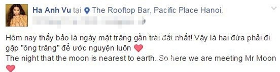 Khi bước vào đời sống hôn nhân, vợ chồng Hà Anh vẫn dành cho nhau những điều ngọt ngào như lúc mới yêu. Đặc biệt, những hành động chuẩn "soái ca" của chồng Hà Anh khiến nhiều người phải ghen tỵ. Gần đây nhất, chân dài Hà Anh chia sẻ hình ảnh cùng chồng ngắm siêu trăng ở một tòa nhà cao tầng. Nhìn khoảnh khắc lãng mạn đến "rụng tim" này, chắc hẳn nhiều người cũng mong lấy được một người chồng tâm lý như Hà Anh.