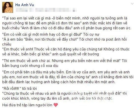 Không ít người cho rằng, những chàng trai "soái ca" chỉ có trong phim hay tiểu thuyết. Nhưng thực tế cho thấy, "soái ca" vẫn tồn tại ngoài đời thực. Nếu như làng giải trí Hoa ngữ, nhiều người phải suýt xoa trước những hành động ngôn tình của diễn viên Huỳnh Hiểu Minh dành cho vợ. Thì ở Việt Nam, cũng có nhiều người được hưởng hạnh phúc từ những ông chồng như thế - trong đó có siêu mẫu Hà Anh.