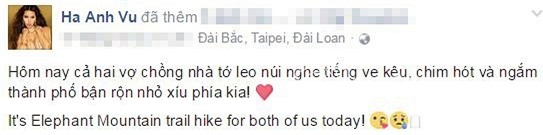 Khi có thời gian rảnh, vợ chồng Hà Anh thường rủ nhau đi trốn. Điểm đến của hai vợ chồng thường là nơi gần gũi với thiên nhiên, lánh xa những ồn ào.