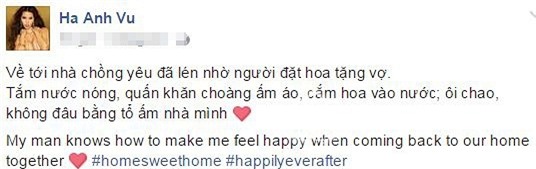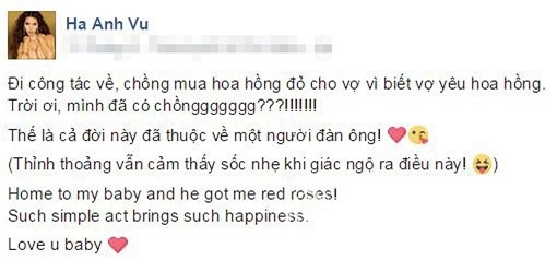 Không tặng siêu xe hay biệt thự nhưng những hành động nhỏ của chồng Hà Anh đã thể hiện được tình cảm với vợ. Mỗi khi đi công tác về, chồng Hà Anh thường mua hoa hồng đỏ theo sở thích của vợ. Hay đơn giản hơn là Olly tự vào bếp để chuẩn bị bữa tối đặt trên bàn có nến và hoa. Chỉ vậy thôi, cũng đủ cho Hà Anh cảm thấy mình là người phụ nữ hạnh phúc nhất thế giới.