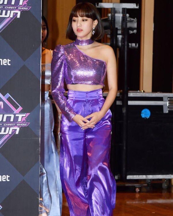 Jihyo cũng diện áo tím đính sequins lồng lộn chẳng kém chị em. Đoá hồng nhóm Twice còn mix thêm quần ống rộng tông xuyệt tông mà chẳng lo âu về vẻ ngoài sến sẩm.