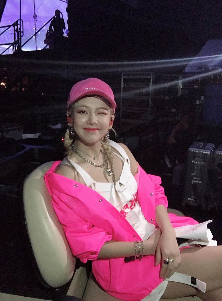 Hyoyeon trẻ trung, năng động hơn với mũ hồng và áo khoác màu hồng sen neon.