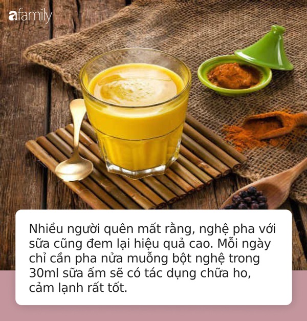 Nghệ nổi tiếng nhất là được trộn cùng mật ong, có tác dụng điều trị đau dạ dày, chữa chứng thiếu máu. Tuy nhiên nhiều người quên mất rằng, nghệ pha với sữa cũng đem lại hiệu quả vô cùng. Mỗi ngày chỉ cần pha nửa muỗng bột nghệ trong 30ml sữa ấm sẽ có tác dụng chữa ho, cảm lạnh rất tốt.