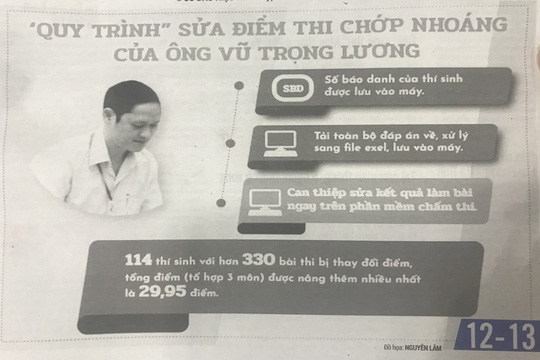 Lợi dụng lỗ hở bảo mật của quy trình này (từ file ảnh chuyển thành file text và có thể chỉnh sửa kết quả trên phần mềm), ông Vũ Trọng Lương đã tải toàn bộ đáp án về, xử lý sang file excel, lưu vào máy, sau đó copy file đáp án của Bộ và dán đè lên file bài làm của thí sinh. Sau khi điều chỉnh kết quả của thí sinh trên file excel, ông Lương tiếp tục sửa bài thi trắc nghiệm. Mỗi bài thi chỉnh sửa chỉ mất khoảng 6 giây.