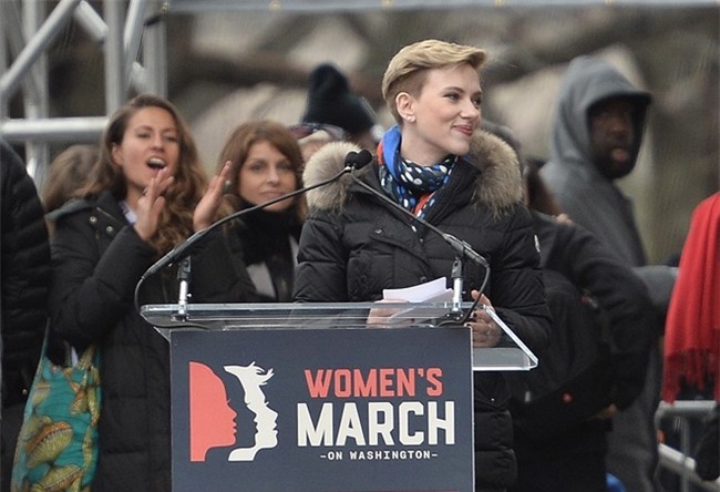 | Nữ diễn viên Scarlett Johansson phát biểu trong cuộc biểu tình ở Quảng trường Quốc gia tại Washington D.C.. Women's Marches được rất nhiều nhân vật nổi tiếng trong giới giải trí ủng hộ và kêu gọi mọi người tham dự. |