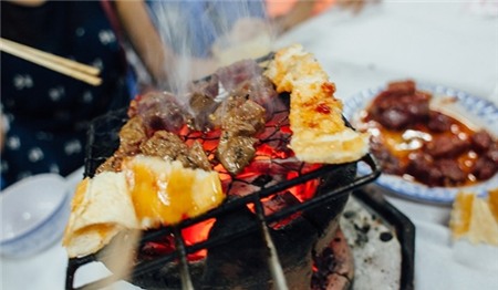 nhanh tay gắp miếng tiếp theo còn đang cháy xèo xèo trên vỉ than hồng.