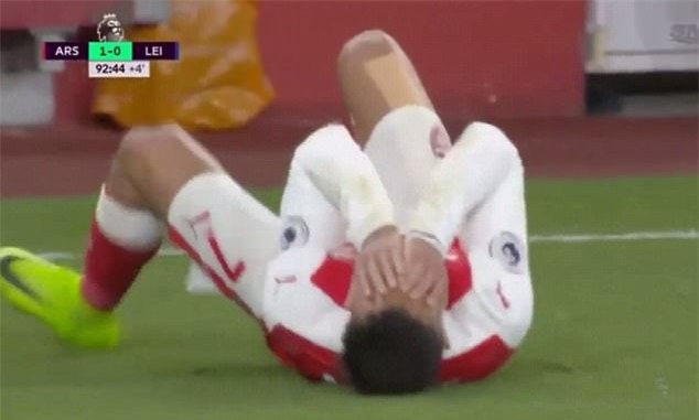 Alexis Sanchez đứng rất gần với đường biên ngang để ngăn quả ném biên của Christian Fuchs. Bóng ném trúng vào vai của Alexis Sanchez nhưng tiền đạo người Chile lại ôm mặt lăn lộn tỏ vẻ vô cùng đau đớn.