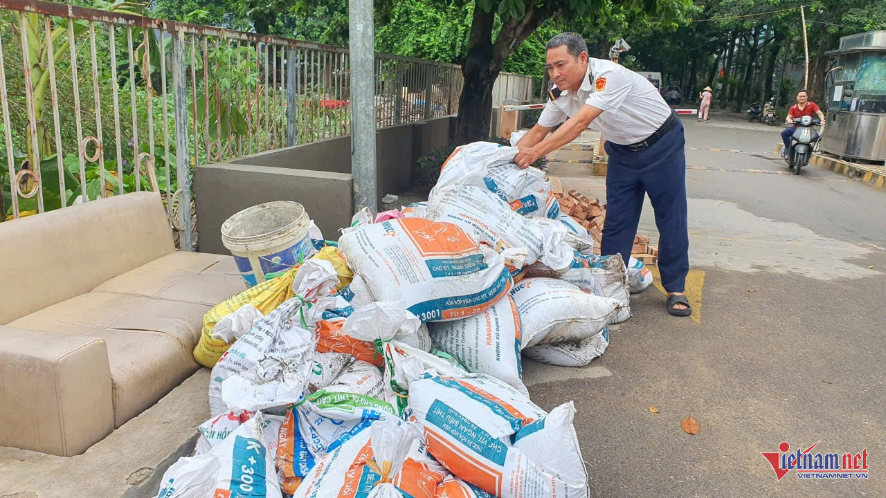 Cư dân Ecohome 1 đã mua hàng trăm bao tải cát để sẵn sàng ứng phó với mưa ngập.