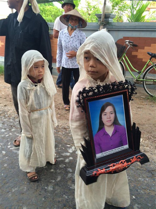 Có lẽ, khó có ai có thể kìm lòng được khi chứng kiến hình ảnh 3 đứa trẻ tiễn đưa người mẹ của mình là chị Nguyễn Thị Giang (29 tuổi, xóm 9 thôn Xương Điền, xã Hải Lý, Hải Hậu, Nam Định) về nơi chín suối. Bố mất, rồi đến khi mẹ qua đời, các bé phải mặc những bộ quần áo tang màu trắng. Có lẽ đó là nỗi ám ảnh quá lớn với các bé.