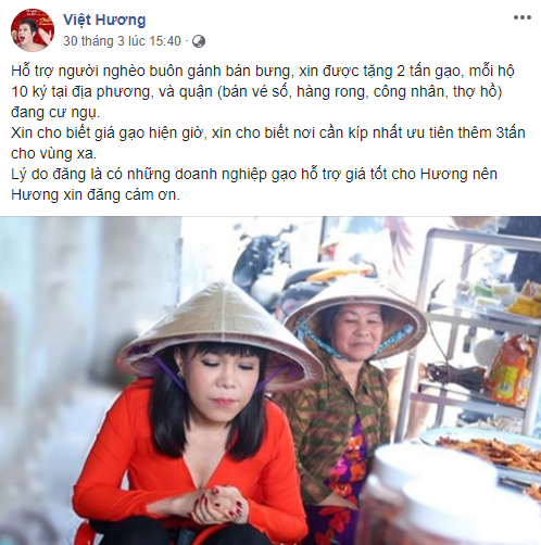 Trên trang cá nhân, Việt Hương thông báo: "Hỗ trợ người nghèo buôn gánh bán bưng, xin được tặng 2 tấn gạo, mỗi hộ 10 ký tại địa phương và quận (bán vé số, hàng rong, công nhân, thợ hồ) đang cư ngụ.