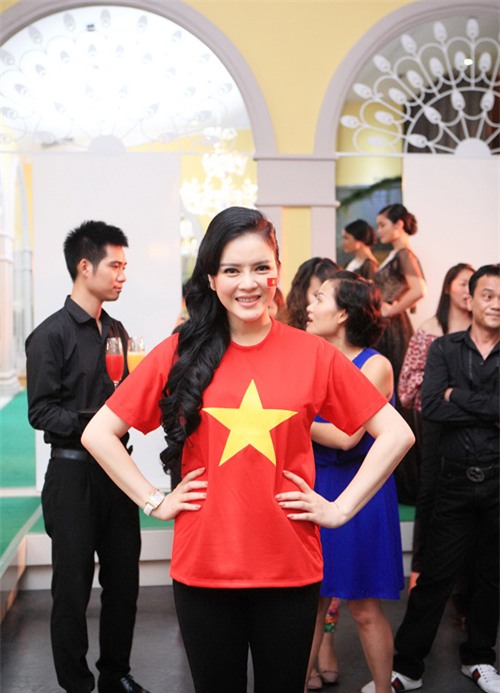 Lý Nhã Kỳ giản dị với trang phục màu cờ Tổ quốc trong buổi đấu giá.