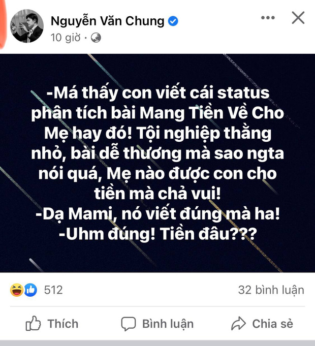 Thế nhưng, vài ngày sau dòng trạng thái này, nhạc sĩ Nguyễn Văn Chung tiếp tục chia sẻ câu chuyện hài hước khác trên MXH. Anh cho biết mẹ cũng ủng hộ quan điểm của anh và ca khúc của Đen Vâu. Đến cuối cùng, mẹ của nhạc sĩ Nguyễn Văn Chung còn tuyên bố: "Tiền của mẹ đâu" khiến netizen bật cười.