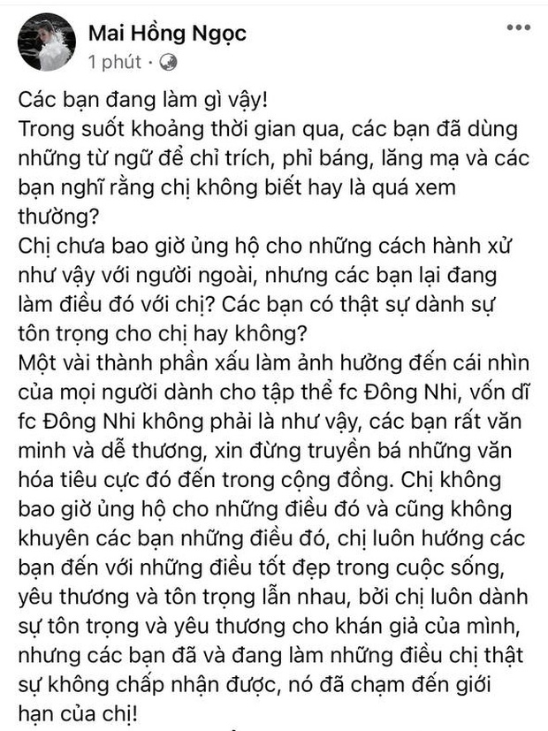 Một vài thành phần xấu làm ảnh hưởng đến cái nhìn của mọi người dành cho tập thể FC Đông Nhi, vốn dĩ FC Đông Nhi không phải là như vậy, các bạn rất văn minh và dễ thương, xin đừng truyền bá những văn hóa tiêu cực đó đến trong cộng đồng. Chị không bao giờ ủng hộ cho những điều đó và cũng không khuyên các bạn những điều đó, chị luôn hướng các bạn đến với những điều tốt đẹp trong cuộc sống, yêu thương và tôn trọng lẫn nhau, bởi chị luôn dành sự tôn trọng và yêu thương cho khán giả của mình, nhưng các bạn đã và đang làm những điều chị thật sự không chấp nhận được, nó đã chạm đến giới hạn của chị!