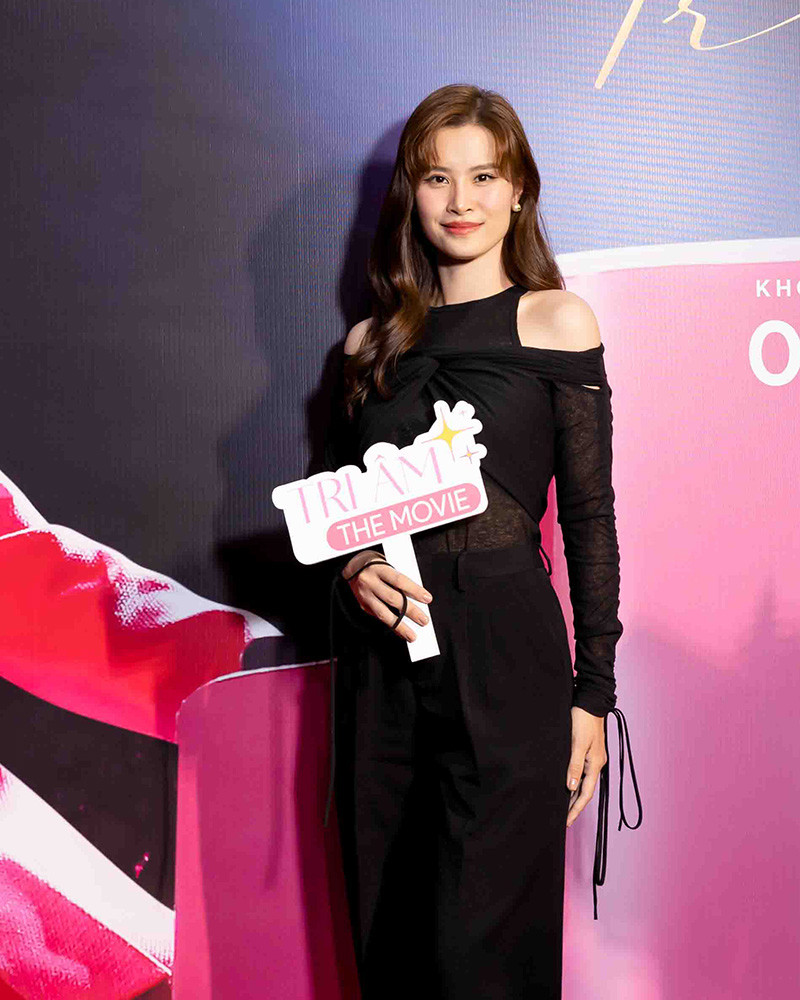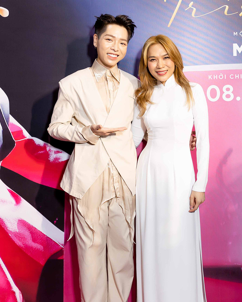Hoàng Thùy Linh tươi tắn mặc đầm cúp ngực đến chúc mừng đàn chị.