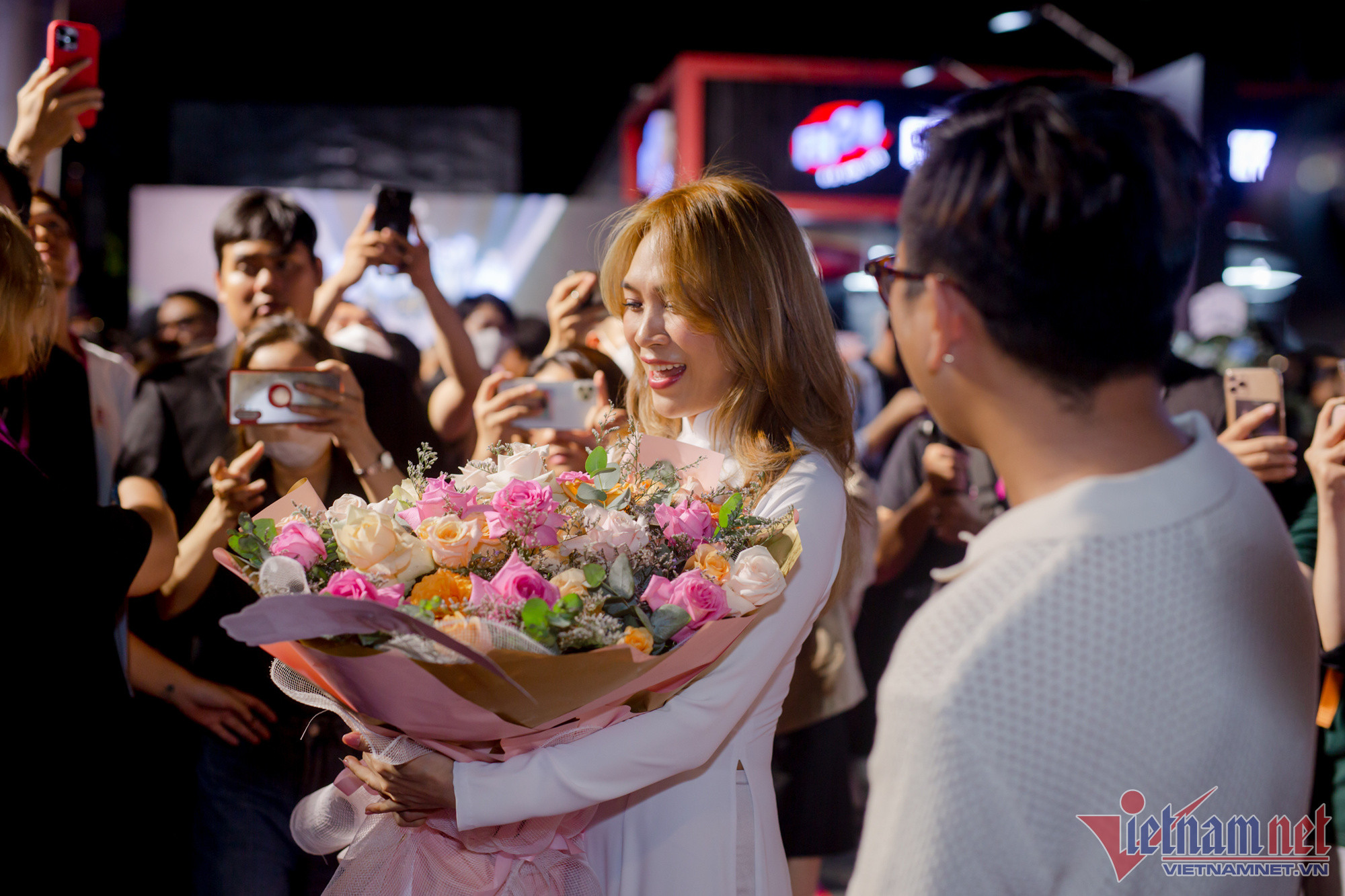 Người hâm mộ Mỹ Tâm có mặt rất đông khoảng 1 tiếng trước giờ diễn ra sự kiện thảm đỏ. "Họa mi tóc nâu" xuất hiện trong bộ áo dài trắng, đi chiếc xe đạp cũ kỹ của tuổi đôi mươi. "Bố" Tùng Yuki phụ trách đội vệ sĩ, đảm bảo an ninh cho "con gái" như thường lệ.