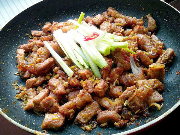 Bước 2: Cho dầu ăn vào chảo nóng, phi thơm tỏi băm. Tiếp đến cho thịt ba chỉ vào xào săn rồi trút sả băm vào đảo cho đến khi tỏa mùi thơm và cạn nước thì cho ớt băm vào đảo 2 phút. Cho mắm ruốc vào, khi mắm sôi vặn lửa nhỏ, nêm nếm lại cho vừa ăn. Đợi một lúc cho mắm cạn và quyện dính vào thịt thì tắt bếp và cho gừng thái sợi vào.