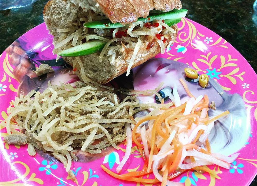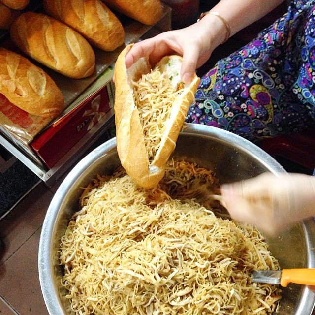 Một món nữa để các tín đồ của da heo được thỏa mãn sở thích của mình chính là bánh mì bì. Thành phần chính của món này tất nhiên là bì heo làm sạch, thái sợi trộn thính. Ngoài ra trong ổ bánh còn có cả thịt heo cắt sợi, dưa chua, dưa leo, rau thơm, ớt.