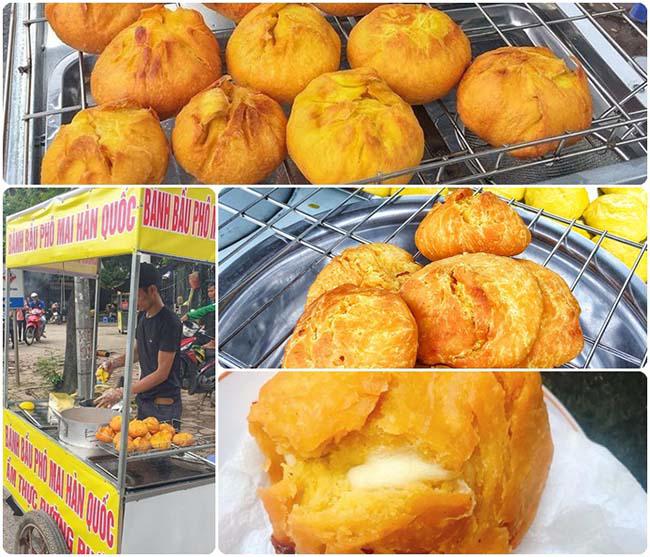 Lâu lâu Hà Nội lại xuất hiện một vài món lạ lạ mà hay đáo để. Bánh bầu phomai Hàn Quốc ngay cổng đại học Điện Lực đang gây sốt thời gian này. Bánh được chiên giòn, có vị ngọt nhẹ. Vỏ bánh được làm từ bột mì, trứng gà, bơ, sữa và đường. Ở giữa bọc thêm chút phomai chảy béo ngậy. Bánh này phải ăn khi còn nóng giòn mới ngon.