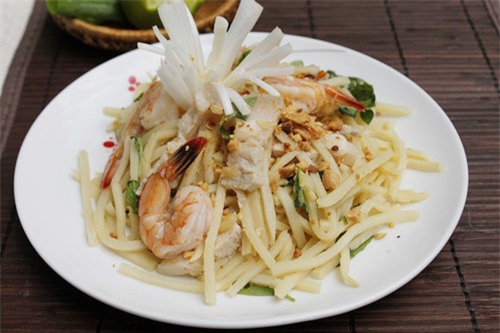 - Tiếp theo cho bát nước mắm, rau răm, rau quế và một ít lạc đã rang vào âu đựng măng, nêm nếm lại gia vị tùy theo sở thích của bạn, đổ ra đĩa dùng kèm với bánh phồng tôm hoặc bánh đa nướng.