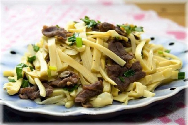 Bắc chảo lên bếp làm nóng dầu ăn rồi cho tỏi vào phi thơm, tiếp đến và thịt bò vào xào tái dưới lửa to rồi trút thịt bò ra đĩa. Vẫn chiếc chảo đó bạn cho thêm dầu vào phi hành tím cho thơm tiếp đến cho măng vào xào nêm nếm một chút mắm, gia vị vào đảo đều sau khi măng chín tới bạn trút thịt bò vào đảo cùng, nêm nếm lại gia vị cho vừa ăn rồi mới cho hành lá, mùi tàu, ớt vào đảo lại 1,2 lượt và tắt bếp.