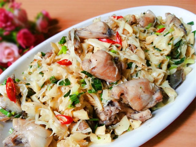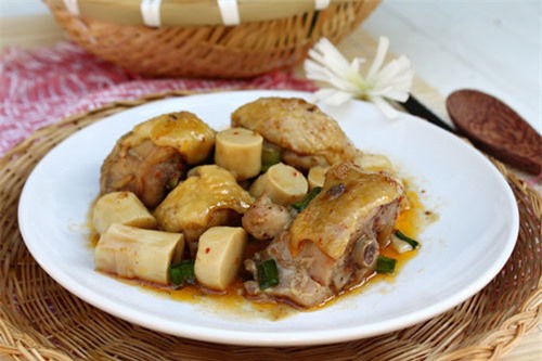- Sau khi gà và măng đã mềm, nêm nếm lại tùy theo khẩu vị của bạn. Tắt bếp, rắc hành lá đã thái nhỏ vào. Múc ra đĩa, dùng với cơm.
