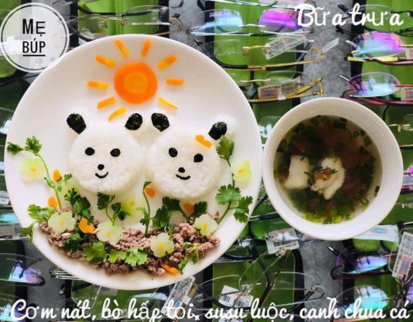 Nhìn những phần cơm tự tay chị Bùi Tuyết (28 tuổi, TP. HCM) làm cho con gái và cho gia đình khiến ai cũng phải thích thú vì sự tỉ mẩn trang trí trong từng món ăn vô cùng ấn tượng, đẹp mắt.