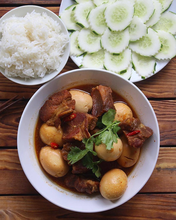 Thịt kho tàu giản dị nhưng bao năm qua luôn giữ vị trí không thể thiếu trên mâm cơm Tết Việt. Chỉ cần nghe hương thơm hấp dẫn, béo ngậy tỏa ra từ nồi thịt kho là thấy Tết kề bên. Món ăn đòi hỏi sự tỉ mỉ, tinh tế của người nấu từ cách chọn thịt, khâu ướp gia vị đến thời điểm thêm nước dừa để thịt kho mềm và có màu nâu vàng sóng sánh. Thịt, trứng với vị đậm đà, màu sắc bắt mắt mang ý nghĩa ấm cúng, sum vầy. Ảnh: Ly.huyn, songk333, chopsticks.and.rice, HelloBacsi.