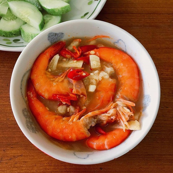 Tôm chua cũng là món ngon đặc trưng của người miền Trung. Món ăn là sự hòa trộn các hương vị hoàn hảo, tôm mang độ mặn của nước mắm, cay và thơm của riềng, tỏi ớt, ngọt của đường, chua và giòn của đu đủ. Tôm chua có ở nhiều nơi, song ngon nhất phải kể đến xứ Huế. Người ta chọn tôm tươi, còn sống, sau đó cắt đầu, rửa sạch, ngâm rượu vài giờ. Tất cả cho vào hũ thủy tinh, đổ nước mắm pha đường vào, rồi đậy kín nắp. Ảnh: Vuttha2108, mebimsuakoi.