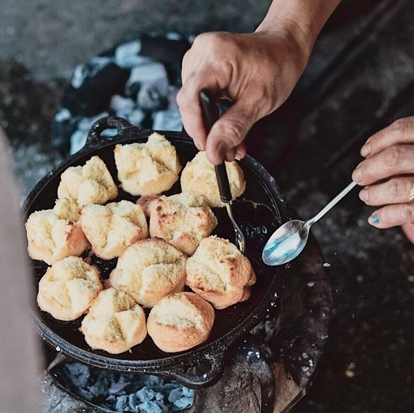 Bánh thuẫn là loại bánh ngọt thường được các gia đình miền Trung chọn dâng lên bàn thờ tổ tiên dịp Tết. Món ăn có mặt từ lâu đời, vị ngọt, xốp không giống bất cứ loại bánh nào. Người thợ đem trứng, đường, bột và vani, đánh bông lên đến khi mịn. Đổ kín bột lên khuôn nướng đã nóng, quét sẵn dầu. Bí quyết để có mẻ bánh thơm, nở đều là thêm gừng, đánh trứng đều tay và canh thời gian than hừng. Ảnh: Anh.vyyy, trungbuii.