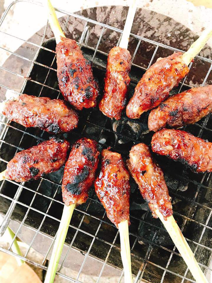 - Chuẩn bị bếp than hoa cho than đỏ lên, xếp các phần thịt bò bọc sả lên rồi nướng. Thỉnh thoảng lật các miếng bò bọc sả chín đều, vàng ruộm thì cho ra, xếp lên đĩa.
