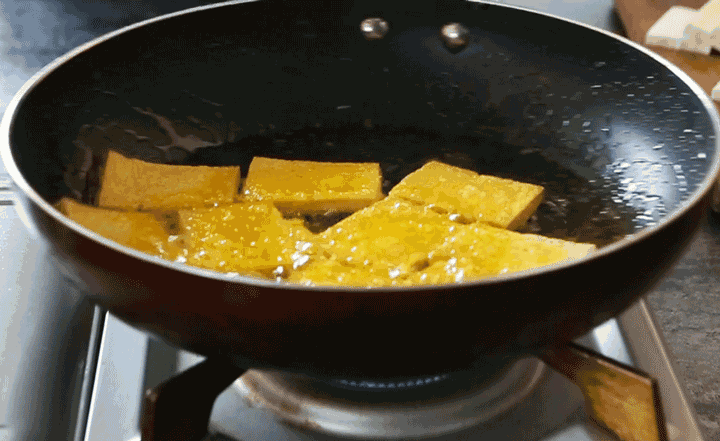 Trước khi rán, hãy cho cả miếng đậu vào ngăn đá 30', sau đó mới lấy ra cắt nhỏ. Mẹo này sẽ giúp đậu giòn xốp, miếng đậu vuông vắn đẹp mắt và không bị vỡ nát trong chảo.