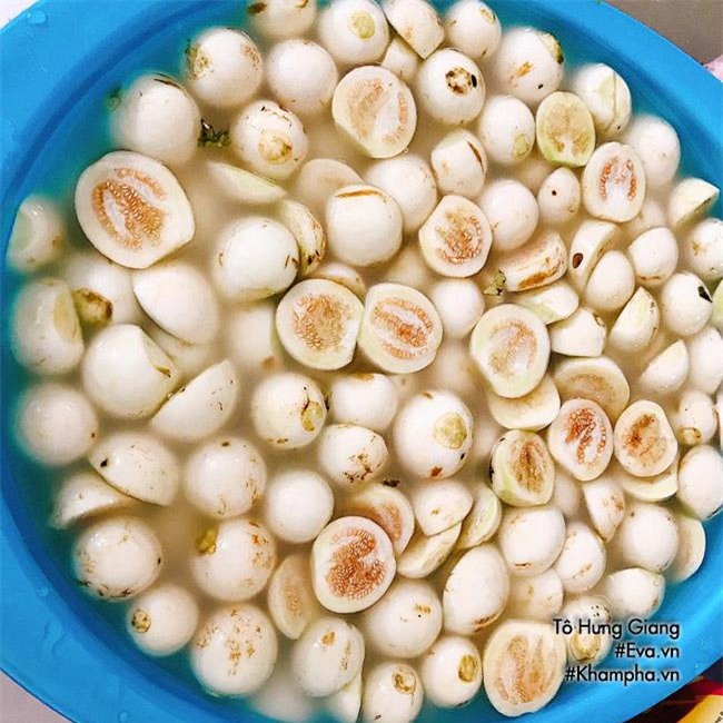Tiếp tục đổ cà vào nước vo gạo ngâm trong 2-3h, cũng là để cà thải bớt chất độc. Sau 2-3h hoặc ngâm lâu hơn tùy điều kiện, ngâm nước vo gạo xong vớt ra rửa vài lần nước cho sạch, lúc này cà sẽ trắng hơn lúc đầu rất nhiều. Vớt cà ra để ráo nước.