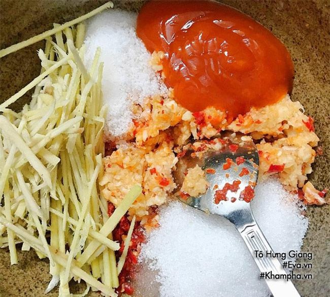 Cho tất cả các nguyên liệu: đường, tỏi, ớt, riềng, tương ớt, giấm, 1 thìa canh muối tinh, 3 thìa canh nước trắng đun sôi để nguội, trộn đều các nguyên liệu thành hỗn hợp sền sệt, nếm thấy cảm giác chua cay mặn ngọt nhưng phần ngọt nhiều hơn và hỗn hợp nếm đậm đà hơn vì còn phải trộn vào cà.