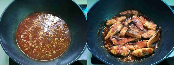Đổ rượu nấu ăn, tương cà, nước tương, đường, giấm và nửa bát nước vào đun sôi cho xốt trở nên sánh thì đổ cá chiên vào đảo đều, rim cho cá ngấm đều gia vị rồi tắt bếp.