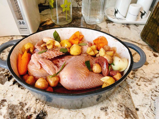 Món gà hầm rượu vang béo ngậy, đẹp mắt.