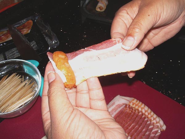 - Bước 2: Thái xúc xích thành từng đoạn dài khoảng bằng chiều rộng của lát thịt, sau đó lấy từng lát thịt ba chỉ đã được ướp xong cuốn thật chặt quanh miếng thịt, cuối cùng dùng que tre xiên vào giữa cuộn thịt để cố định. Làm lần lượt như vậy đến khi hết thịt và xúc xích.