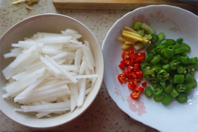 Củ cải gọt vỏ thái sợi, gừng thái sợi, ớt và hành thái nhỏ.