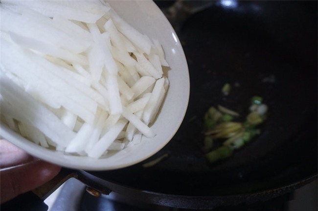 Cho phần gừng còn lại và gốc hành vào chảo xào thơm, thêm củ cải vào xào qua.