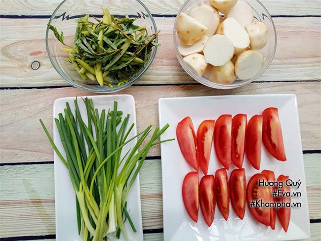 Bước 2: Cà chua, hành, mùi, khoai sọ gọt vỏ, rau rút nhặt ngọn non rồi rửa sạch. Cà chua bổ múi cau, khoai sọ cắt miếng vừa ăn. Hành, mùi cắt nhỏ.