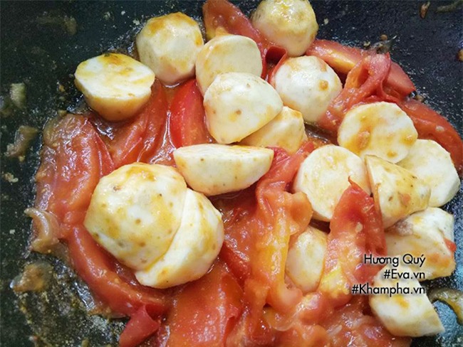 Bước 3: Phi thơm hành khô với dầu ăn cho cà chua vào xào sơ, thêm phần gạch cua vào xào cùng. Tiếp đến cho khoai sọ vào xào sơ. Nêm 1 thìa bột nêm để cà chua mau mềm.