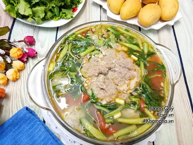 Tắt bếp chút canh cua khoai sọ rau rút ra bát ăn kèm với rau sống.