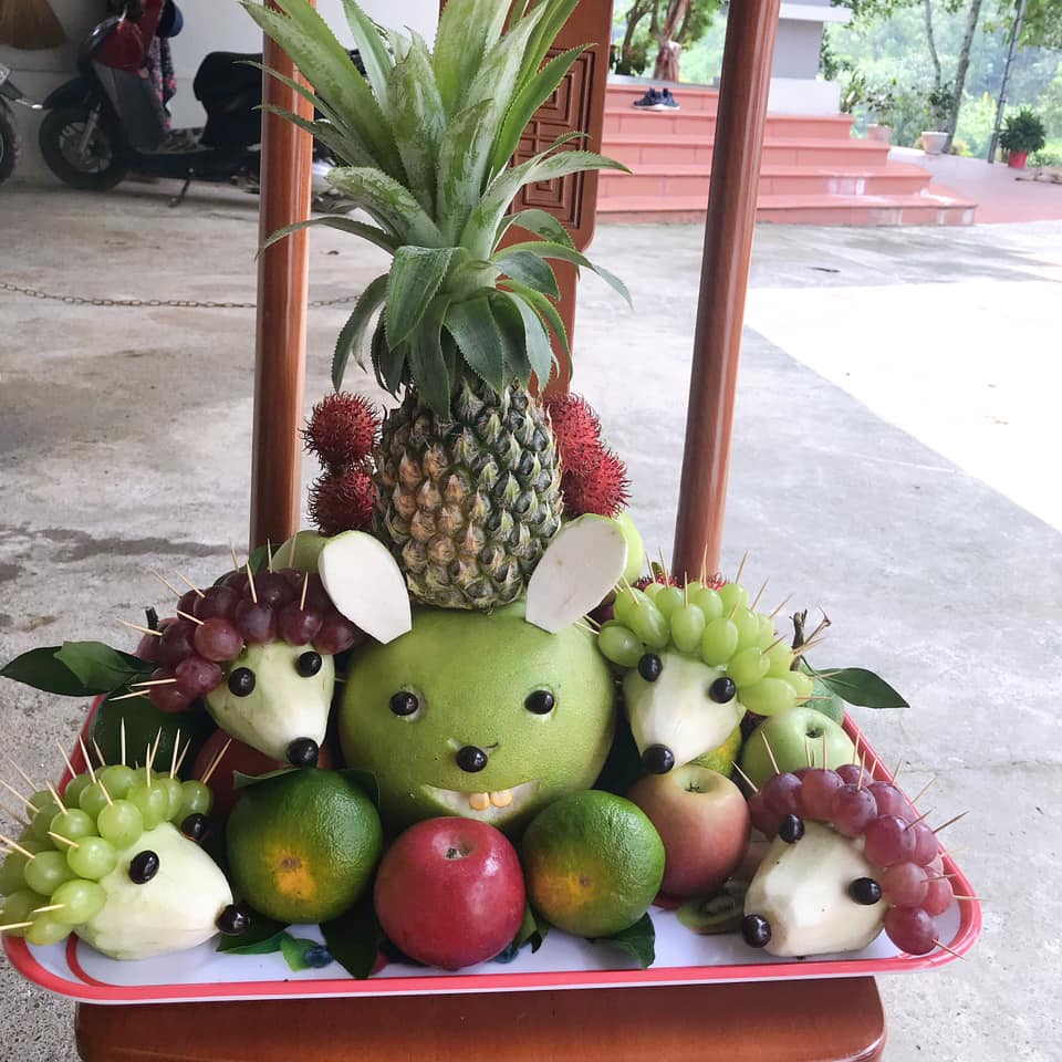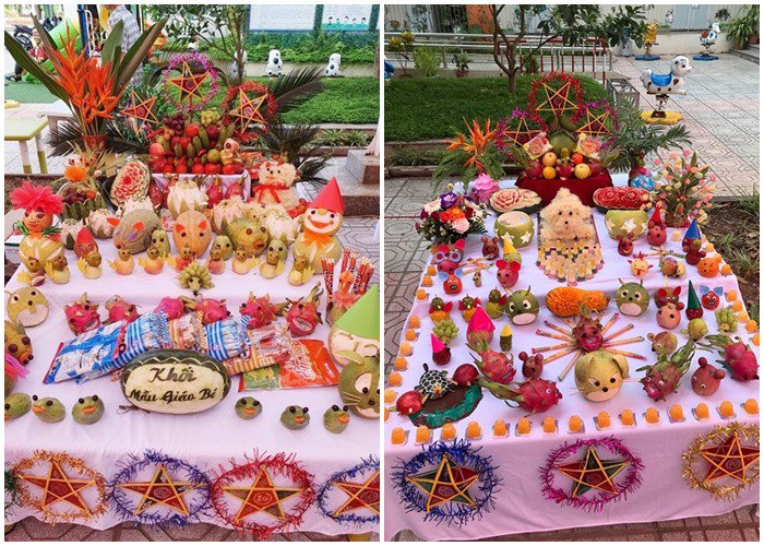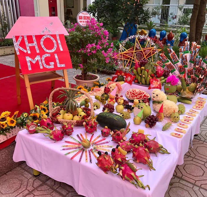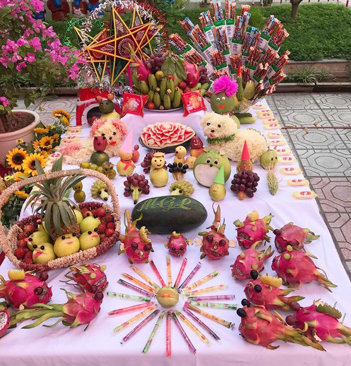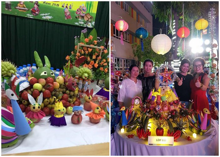 Trên mâm cỗ có đủ loại hoa quả tạo hình thành các con vật khác nhau, từ chó bưởi đến cá từ thanh long; chuột, mèo, lợn... từ bưởi hay dưa hấu; nhím từ nho... Tất cả đều rất sinh động. Kết quả, lớp con trai chị Thanh Mai đạt giải nhất trong cuộc thi, điều này khiến chị và các phụ huynh khác thích thú vô cùng. Mặc dù là Tết dành cho các con nhưng vẫn đem lại niềm vui cho cha mẹ, những người thực sự quan tâm đến dịp lễ cổ truyền này.