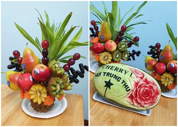 Tương tự như chị Mai, chị Bảo Yến (Mẹ của bé Minh Tú - Hà Nội) cùng các phụ huynh khác trong lớp học mẫu giáo của con, mỗi người cùng tham gia đóng góp, tỉa hoa quả để bày mâm cỗ Trung thu. Chị tự tay tỉa lọ hoa rất đẹp mắt khiến các bé rất thích.
