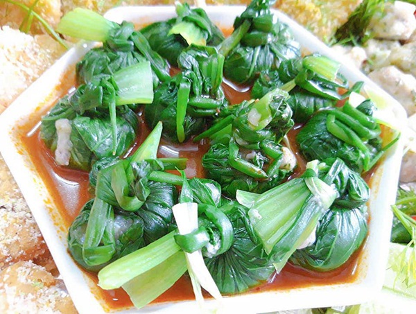 Cá phi lê thái nhỏ cho vào máy xay cùng chút tiêu, muối, hạt nêm, gừng hành xay mịn. Sau đó, trộn chút giò sống, quệt thành hỗn hợp dẻo. Sau đó xúc từng thìa cho vào lá cải cuộn, dùng lá hành chần buộc lại cho vào đĩa sâu lòng.