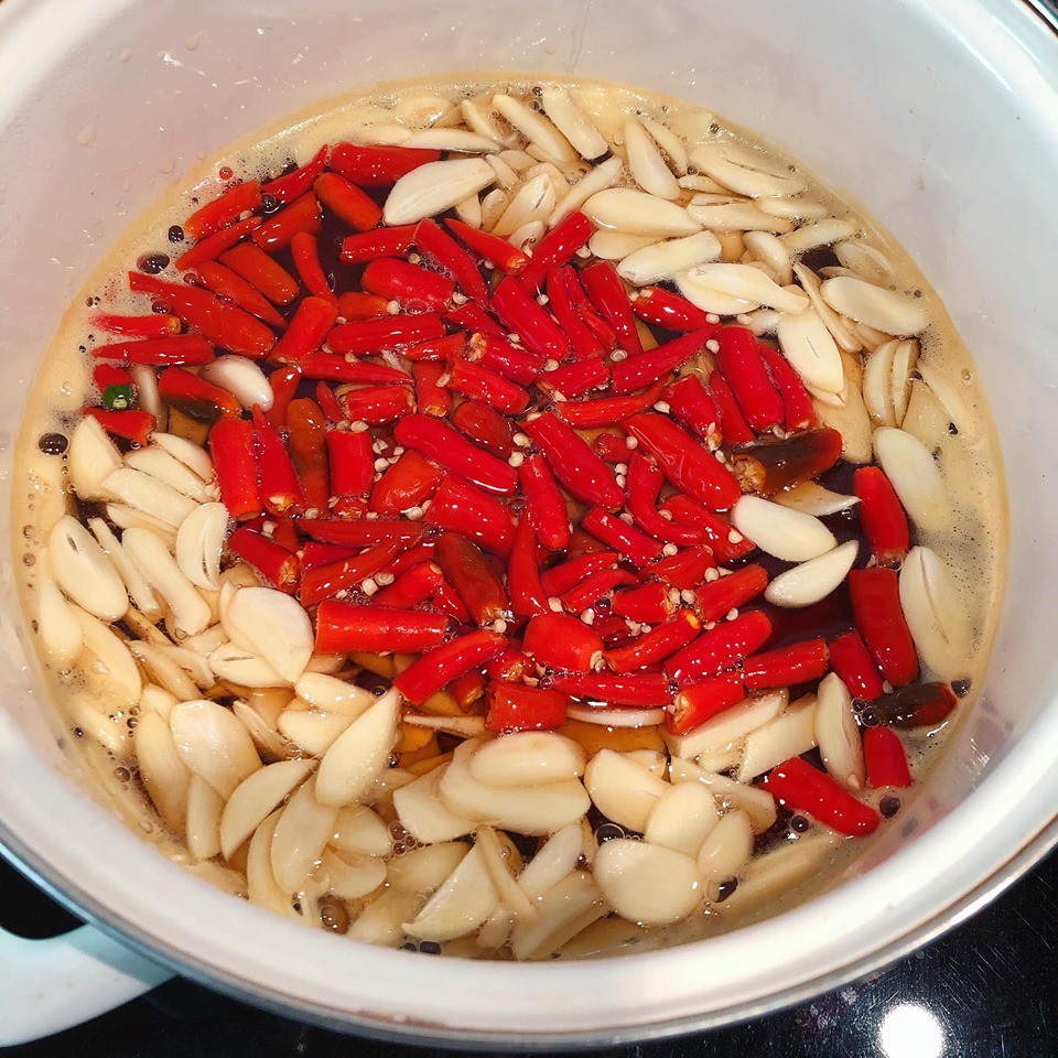 - Tiếp đến, bạn đổ nước mắm và đường vào nồi, đun lên cho ấm. Khi hỗn hợp nóng già, bạn đổ tỏi và ớt vào.